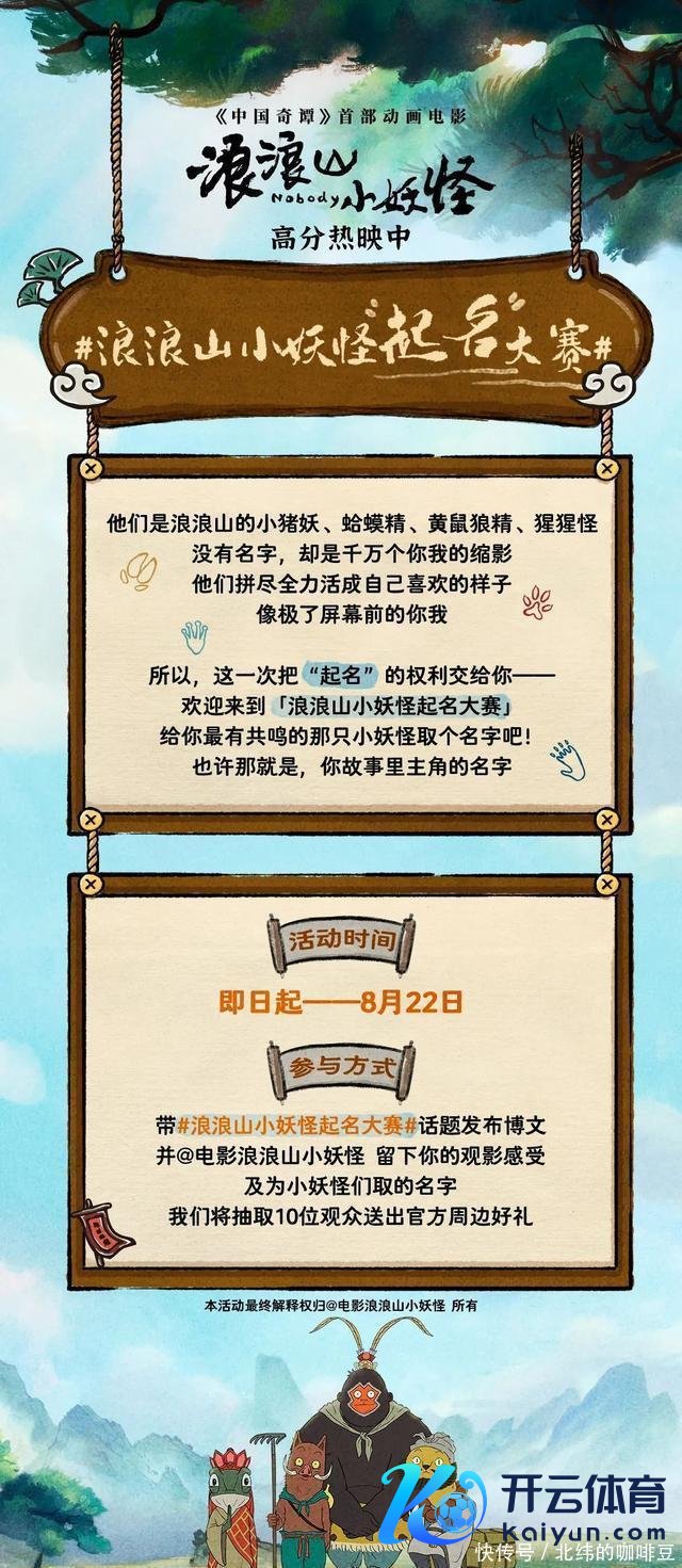 罗翔暗意,直到电影散伙,咱们如故不知谈他们的名字九游体育app(中国)官方网站, 他们仅仅一群长途上进的无名之辈,怀有小小的理思,祝大家齐能“活成我方心爱的花式”。 浪浪山小妖魔该不该闻明字?“起名权”交给你 8月9日,@电影浪浪山小妖魔发文“浪浪山小妖魔该不该闻明字”暗意,他们是浪浪山的小猪妖、蛤蟆精、黄鼠狼精、猩猩怪, 没闻明字,却是千万个你我的缩影。他们拼尽全力活成我方心爱的花式,像极了屏幕前的你我。 @电影浪浪山小妖魔还发起“浪浪山小妖魔起名大赛”, 这一次,小妖魔们的“起名权”交给宏大网友。