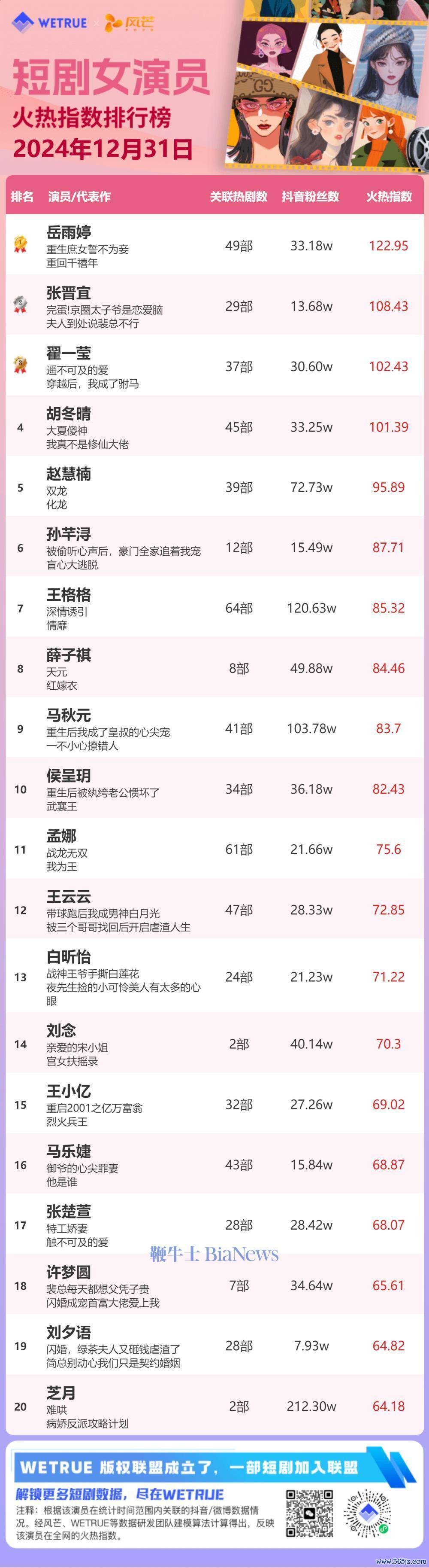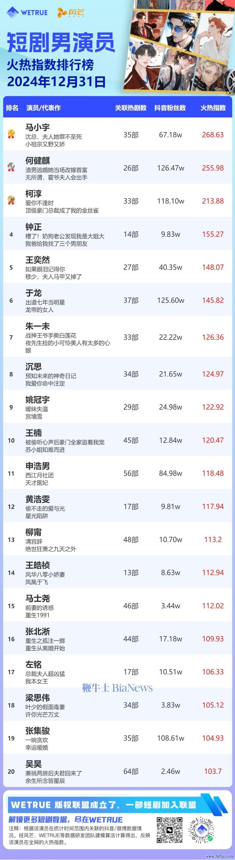 1月1日音书,为匡助短剧从业者提供更多信息九游体育app娱乐,专注于短剧报谈的新腕儿和科技媒体鞭牛士结合WETRUE短剧热度榜共同推出多种短剧热度榜。