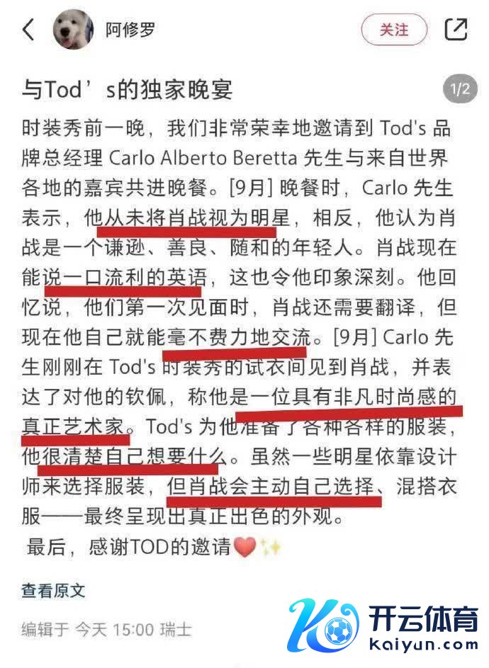近日对于TODS的独家晚宴的情况曝出,品牌总司理Carlo Alberto Beretta先生谈到了肖战。与肖战的第一次碰面还需要翻译九游体育app娱乐,而这一次碰面肖战却能说一口流利的英语,令他直呼印象久了。