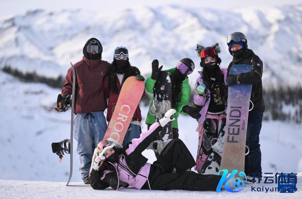 1月28日,来自浙江的“95后”小姐张琦彬(前)与一齐滑雪过年的同伴们在新疆阿勒泰将军山海外滑雪度假区合影。新华社记者 胡虎虎 摄