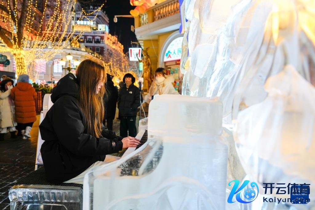 1月30日,旅客在哈尔滨中央大街上弹奏冰钢琴。新华社记者 王建威 摄