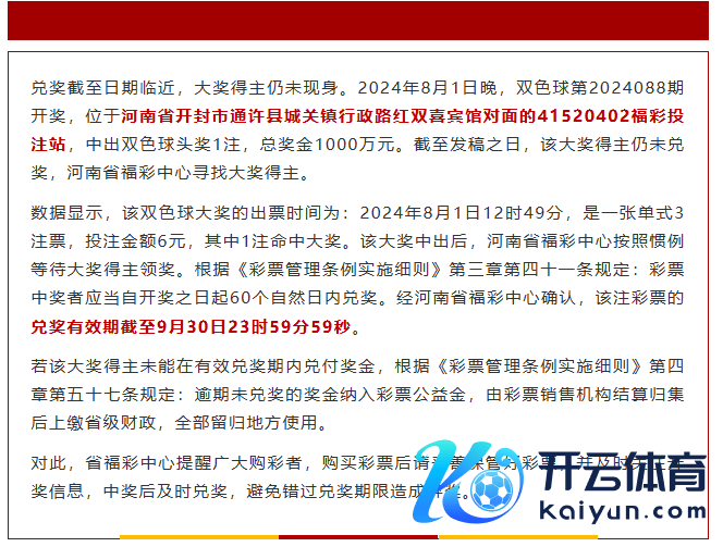 近日,河南省福彩中心正在伏击寻找一位大奖得主,这位侥幸儿在2024年8月1日晚的双色球第2024088期开奖中,于开封市通许县城关镇行政路红双喜宾馆对面的41520402福彩投注站,侥幸中得头奖1注,奖金高达1000万元。关联词现金九游体育app平台,适度发稿时,该得主尚未现身领奖。
