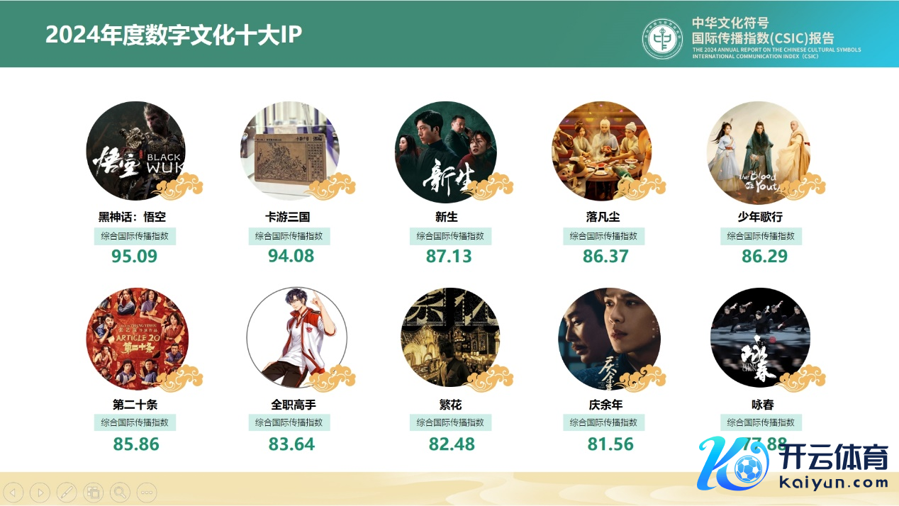 在轮廓研讨文化传播深度、文化翻新性与符合性、文化影响力、受众反馈等要素的基础上,蛊惑国际传播指数模子,讲述索取出“2024年度数字文化十大IP”,涵盖电影、电视剧、游戏、潮玩、网文、动漫、舞剧等多种数字文化传播载体。其中《黑传闻:悟空》以95.09的轮廓国际传播指数排行第一,《卡游三国》《重生》紧随后来;激发了收视怒潮的电视剧及网罗文体IP《庆余年》,以及被称为“电竞第一IP”的《全职能手》也入围前十。