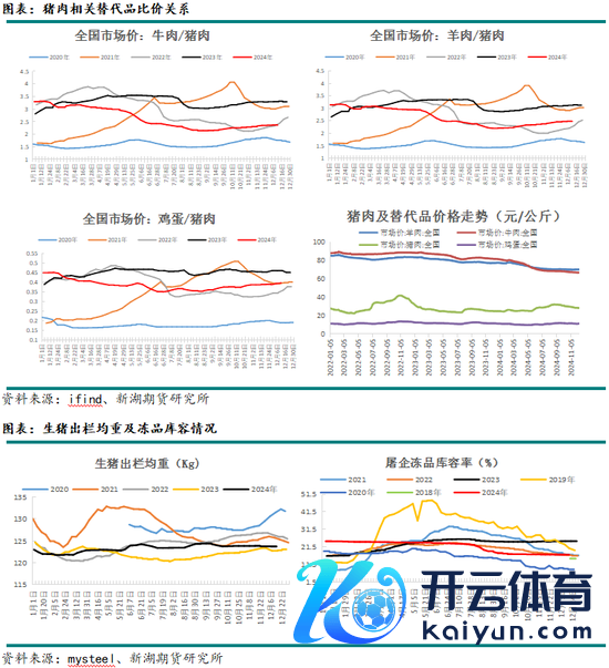 2024年受制于生猪供应下降,生猪宰杀数据彰着低于旧年同期。通过牛肉、羊肉、鸡蛋这三种替代品和猪肉的比价关联来看,2024年比值彰着低于旧年同期,猪价高涨提振其他替代品破钞,不外跟着生猪价钱下落,猪肉比价上风总结,成心于2025年猪肉破钞回升。