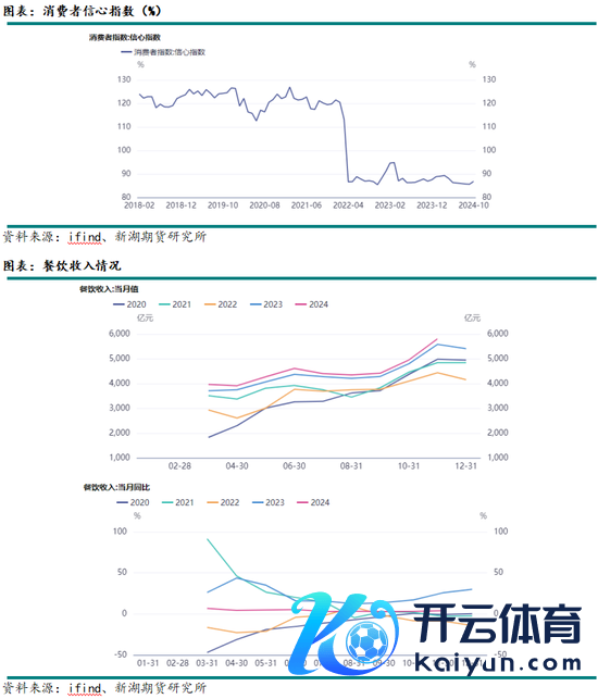 2022年破钞者信心指数断崖式下落,2022年12月受疫情管控策略放开影响,破钞者信心指数反弹回升,于2023年3月份见顶,随后再度回落运转低位徬徨,2024年破钞者信心指数再度走弱,9月底靠拢2022年低点,不外9月下旬,宏不雅策略提振下,10月份破钞者指数回升。2024年餐饮业收入增幅同比彰着缩小,2025年仍需眷注宏不雅策略发力对市集破钞来带的提振。