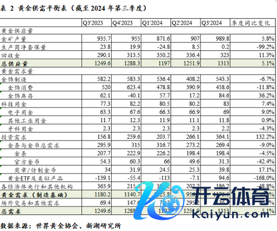 金矿的开采周期较长,每年增速守护较低水平。全球矿产金量从1900年的386吨增长至2023年的3644吨,复合增速为1.8%。频年来,全球黄金产量步入平台期,2018-2023年复合增速仅为-0.1%。把柄全球黄金协会的数据,本年前三季度矿产金环比有所加多。