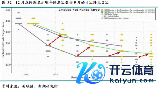 二是 点阵图清晰,好意思联储官员们对来岁的降息的中位数疏导为2次(9月为4次、此前阛阓预期为3次)。在19位官员中,有10东说念主预测2025年底前还有2次或以上降息,两外3东说念主预测只消1次,剩余1位预测不再降息。2025和2026年末利率预测中值均上升0.5个百分点至3.9%和3.4%,决策者们以为好意思国的中性利率有所抬升。