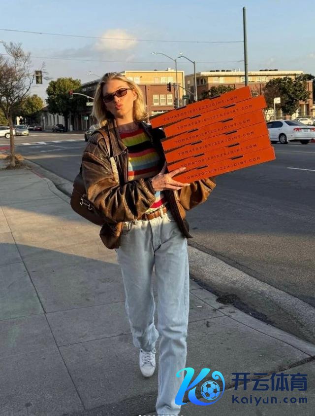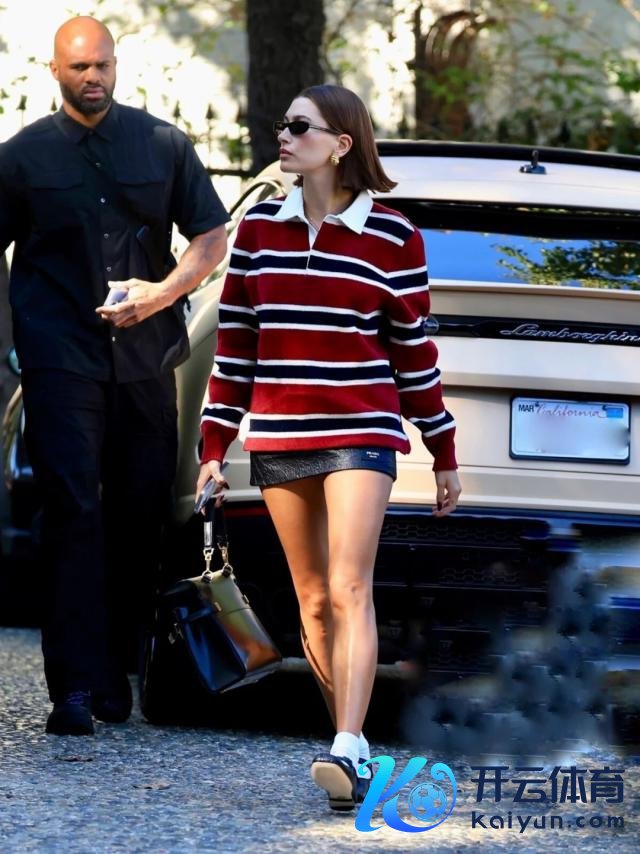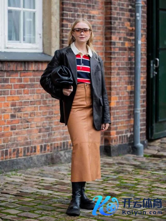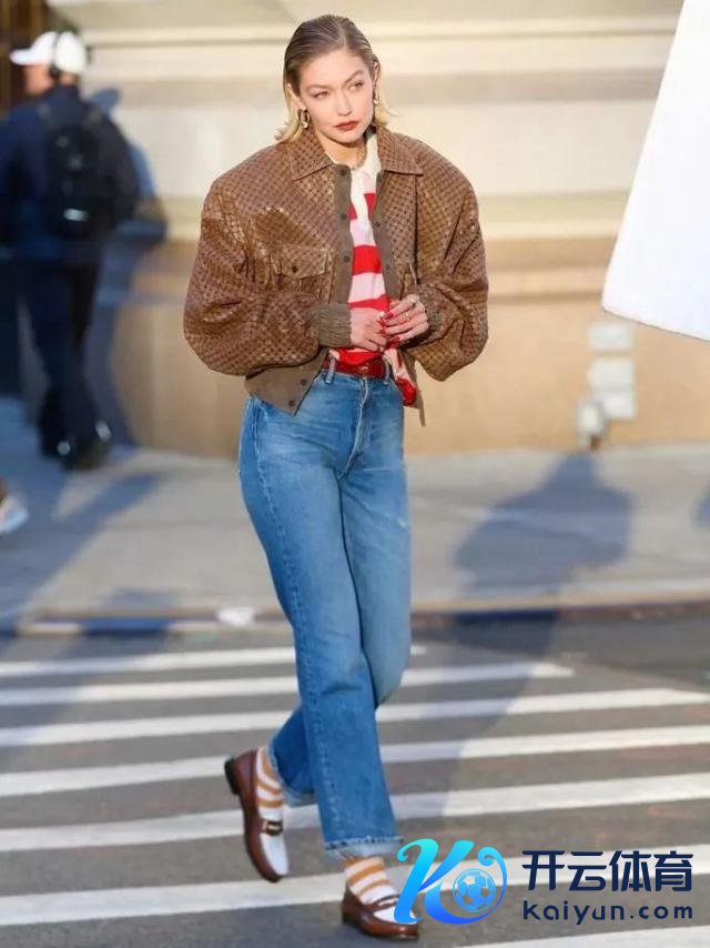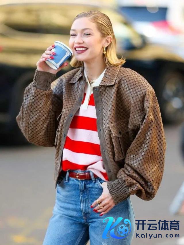 Gigi 在街拍中也有一组条纹 polo 衫 + 皮夹克的组合,吸睛又满满的好意思式相沿感。