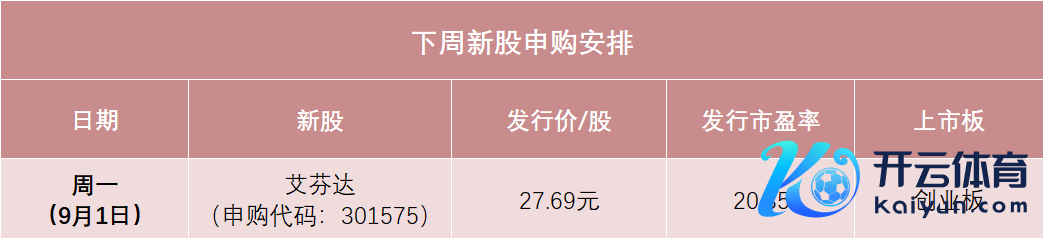 凭证当今的刊行安排,下周只须1只新股可申购,即下周一(9月1日)的创业板新股艾芬达。