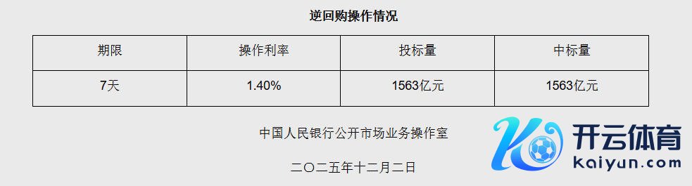 中新网12月2日电 据央行网站音信九游体育app娱乐,2025年12月2日中国东谈主民银行以固定利率、数目招标神气开展了1563亿元7天期逆回购操作。具体情况如下: