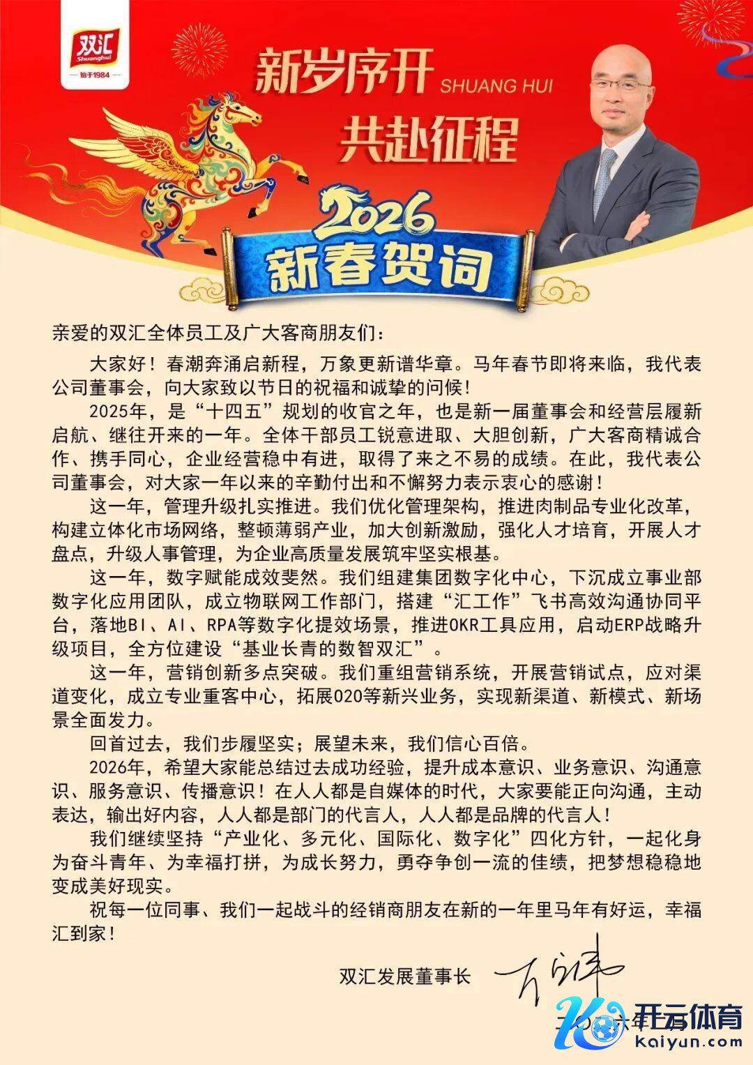 在马年春节行将驾临之际九游体育娱乐网,双汇发展董事长万宏伟通过企业官方平台,向合座职工和客商一又友发表2026年新春贺词。全文如下: