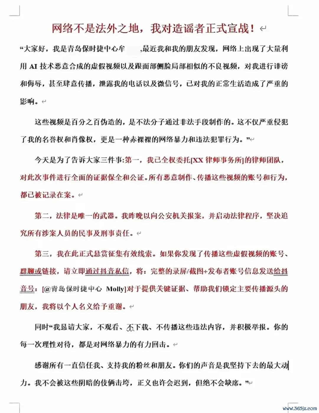 极目新闻报说念,此前,青岛保时捷销售中心牟女士通过酬酢媒体称:网络上出现大皆应用AI时间坏心合成的伪善视频以及跟面部侧脸局部同样的不良视频,对她进行降低和侮辱,甚而鼎力传播,知道她的电话以及微信号,已对日常生计形成了严重的影响。文中称,这些视频是百分之百伪造的,由犯科分子通过造孽妙技制作。她已寄予讼师团队,对这次事件进行左证保全和公证。