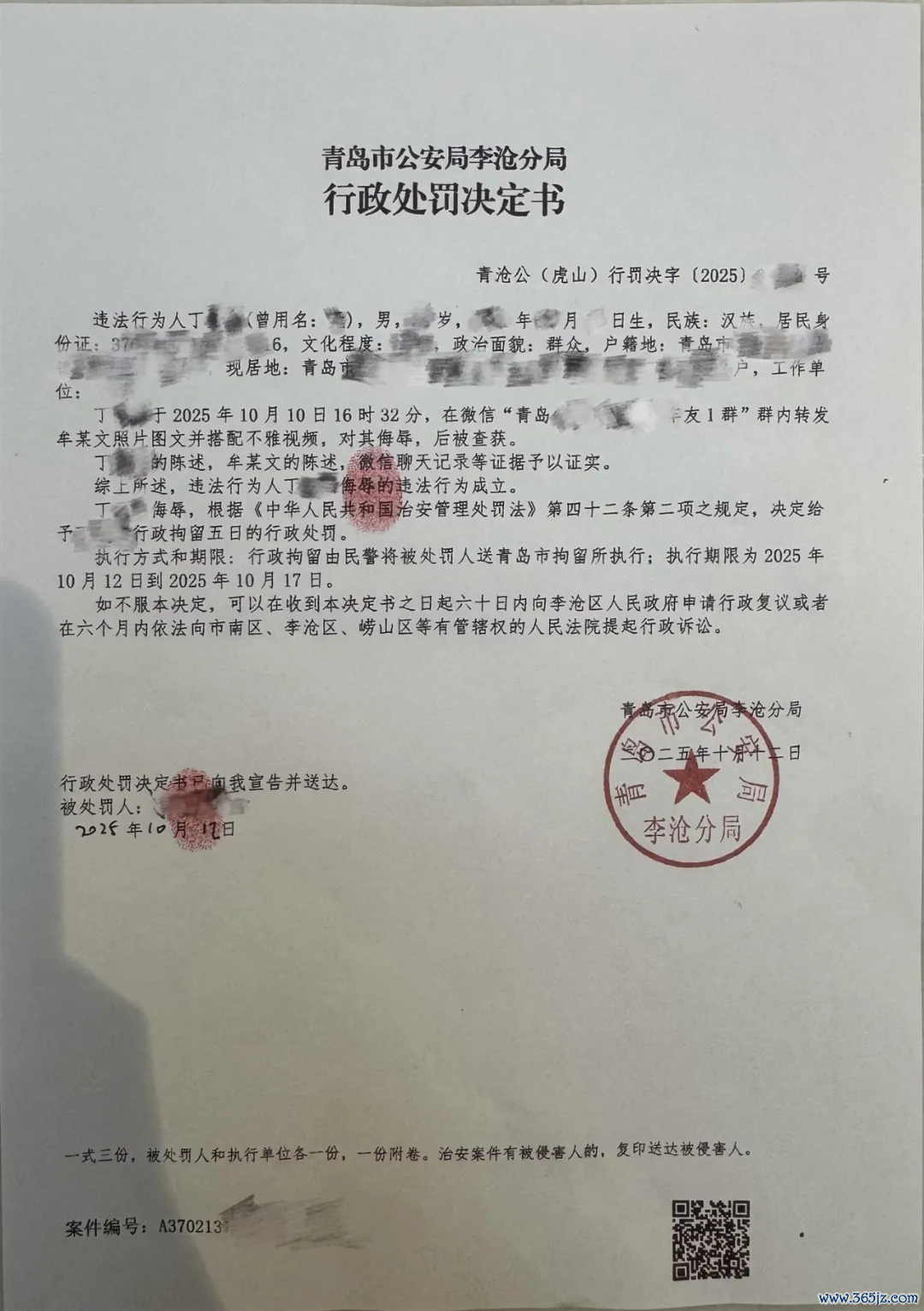根据牟女士向记者提供的青岛市公安局李沧分局行政处罚决定书,警方查获,又名须眉于10月10日16时32分,在微信群内转发牟女士像片图文并搭配瞻念视频,对其侮辱,决定给以该须眉行政拘留五日的行政处罚。